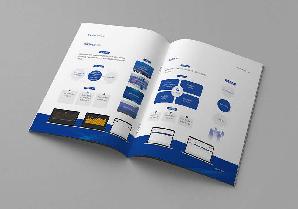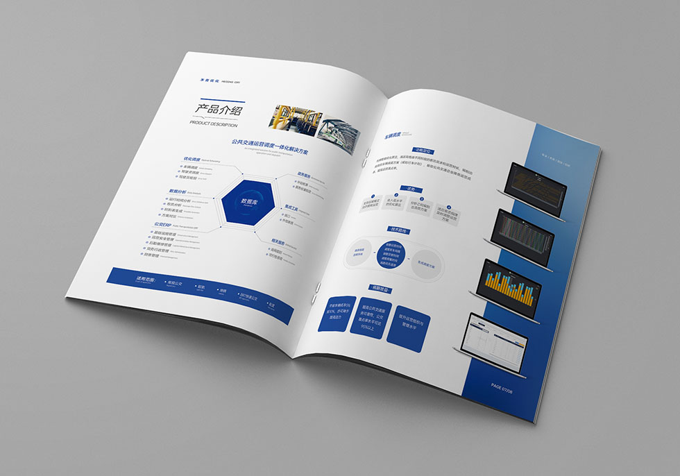 項目背景:武漢禾青優(yōu)化科技有限公司創(chuàng)建于2019年6月,軟件著作權(quán)10項,發(fā)明專利5項,以全面建設(shè)公共交通運營服務(wù)智能化為核心,為用戶(政府、公交企業(yè)、乘客)提供智能公交一體化解決方案,幫助建成高品質(zhì)、高效益的公共交通服務(wù)體系。艾的爾承接其畫冊設(shè)計制作,成立品牌設(shè)計小組,與企業(yè)進行深入溝通,明確企業(yè)對于畫冊設(shè)計的需求,畫冊采用藍色與白色,體現(xiàn)科技感,奠定了畫冊整體基調(diào)。封面以公交現(xiàn)線圖為載體,體現(xiàn)企業(yè)主營業(yè)務(wù),表現(xiàn)手法比較創(chuàng)新,內(nèi)頁圖片采用跨版的表現(xiàn)手法,大氣高級,提煉核心要點,進行精煉設(shè)計。封面采用藍色,藍色則寓意企業(yè)、汽車等標準色,它代表智慧,象征著和諧世界、永不言棄的精神。