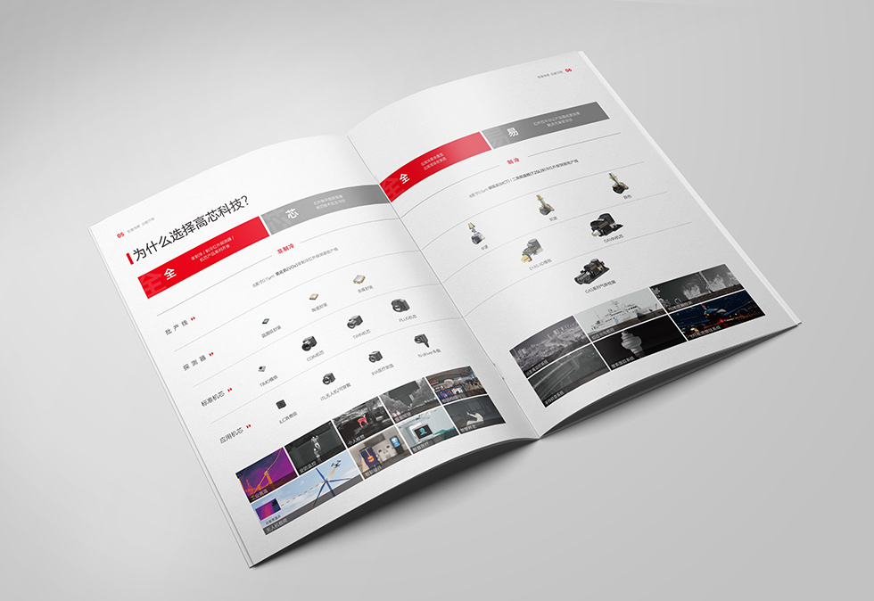 項(xiàng)目背景:武漢高芯科技有限公司掌握了紅外熱成像技術(shù)的核心——紅外焦平面探測器,致力于為全球紅外熱成像用戶提供專業(yè)的非制冷和制冷紅外探測器、機(jī)芯模組以及應(yīng)用解決方案。公司產(chǎn)品品類豐富,覆蓋多種面陣規(guī)格、多種像元尺寸以及多種波段組合 。產(chǎn)品靈敏度高、可靠性好,各項(xiàng)性能指標(biāo)達(dá)到國際先進(jìn)水平,已廣泛應(yīng)用于人體測溫、工業(yè)測溫、安防監(jiān)控、無人機(jī)載荷、氣體泄漏檢測、戶外夜視、智能駕駛、物聯(lián)網(wǎng)、智能家居、智能硬件等領(lǐng)域。艾的爾設(shè)計(jì)接受其委托,承接畫冊設(shè)計(jì)項(xiàng)目。在畫冊設(shè)計(jì)、創(chuàng)意的過程中,設(shè)計(jì)師通過對行業(yè)屬性進(jìn)行深入地了解,在畫冊的封面設(shè)計(jì)中,創(chuàng)意的過程中,設(shè)計(jì)師通過對行業(yè)屬性進(jìn)行深入地了解,以身臨其境的設(shè)計(jì)思路,去探索紅外熱成像的新世界。在封面設(shè)計(jì)中,邊框留白,使芯片背景圖更加聚焦,讓畫面整個(gè)留有呼吸的空間,突出芯片灰色部分,紅色與灰黑色搭配,與企業(yè)logo色相呼應(yīng)。在內(nèi)頁的設(shè)計(jì)中,用表格的形式突出重點(diǎn),表格間距把畫面拉滿,既不呆板又留有透氣的空間。內(nèi)頁的顏色也以白色為主,整體給人大氣、智慧的印象。整個(gè)畫冊傳達(dá)出了理性、專業(yè)的視覺形象,對塑造企業(yè)專業(yè)、實(shí)力的形象有極大的作用。
